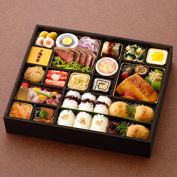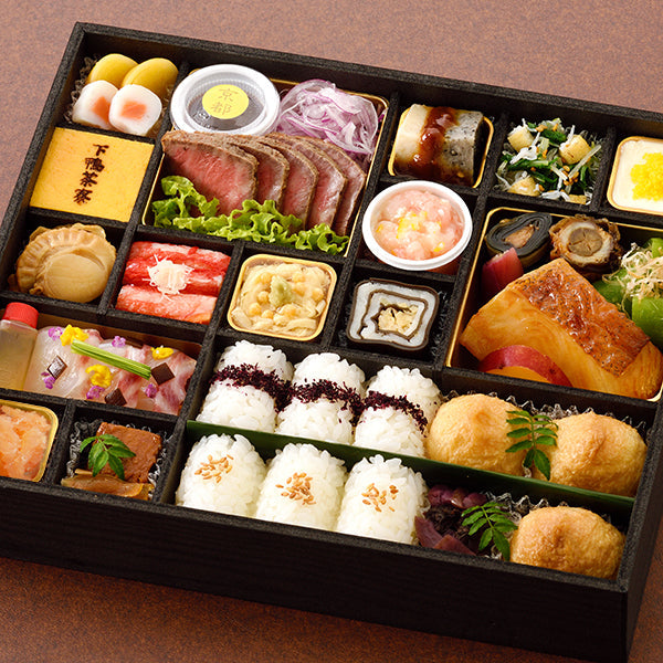 和牛ローストビーフ、玉ねぎ、青野菜、ワインソース、子持ち烏賊、身巻鮭真丈、厚焼玉子、焼帆立貝、蟹甘酢漬、胡瓜、生姜、生ゆば旨味あん掛、ぶぶあられ、山葵、求肥巻、水菜とじゃこの和え物、甘海老の塩麴和え、生麩田楽、クリームチーズの味噌漬、唐墨、鯛の昆布〆、なます、煎り酒、きんぴらまぐろ、帆立ひもたらこ雲丹和え、鰈の西京焼、鰻の八幡巻、鰊昆布巻、青唐煮びたし、甘藷レモン風味煮、酢取り茗荷、俵ご飯、いなり寿し、芝漬