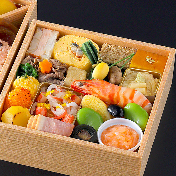 赤飯、う巻、蟹入生酢、海老蓮根挟み揚げ、飛龍頭煮、牛時雨煮、厚焼玉子、里芋煮、鰆幽庵焼、ゆばのあんかけ、鶏松風、鰊昆布巻、鶏信田巻、甘藷レモン風味煮、帆立ひもたらこ雲丹和え、蟹味団子、茄子浸し、揚げ豆腐、海老煮、合鴨燻製、椎茸煮、南瓜煮、いか松笠雲丹焼、巾着餅、奈良漬、一寸豆煮、栗甘露煮、葱煮、いんげん煮、花麩煮、子持いか、酢茗荷、銀杏むかご松葉刺し、青唐揚げ煮、ごま塩、黒豆煮、人参煮、わさび